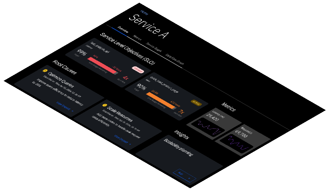 The Service Impact Analysis Worker uses the Causality Graph to automatically analyze the impact of the root causes on SLOs, prioritizing the root causes based on the violated SLOs and those that are at risk. Causely automatically defines standard SLOs (based on latency and error rate) and uses machine learning to improve its anomaly detection over time. However, environments that already have SLO definitions in another system can easily be incorporated in place of Causely’s default settings.