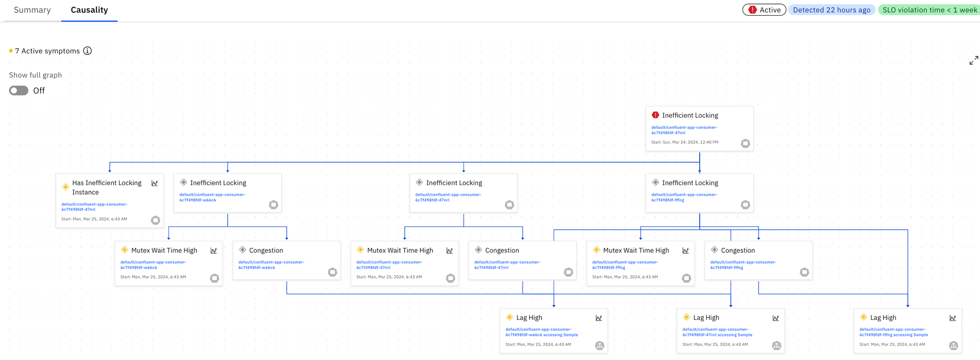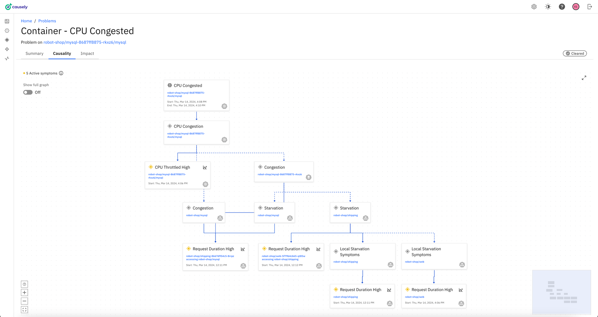 In this example, a CPU congestion in a Kubernetes Pod is the root cause and this causes symptoms – high latency – in application services that it is hosting. In turn, this results in high latency on other applications services. In this situation the causal relationships are clearly explained.